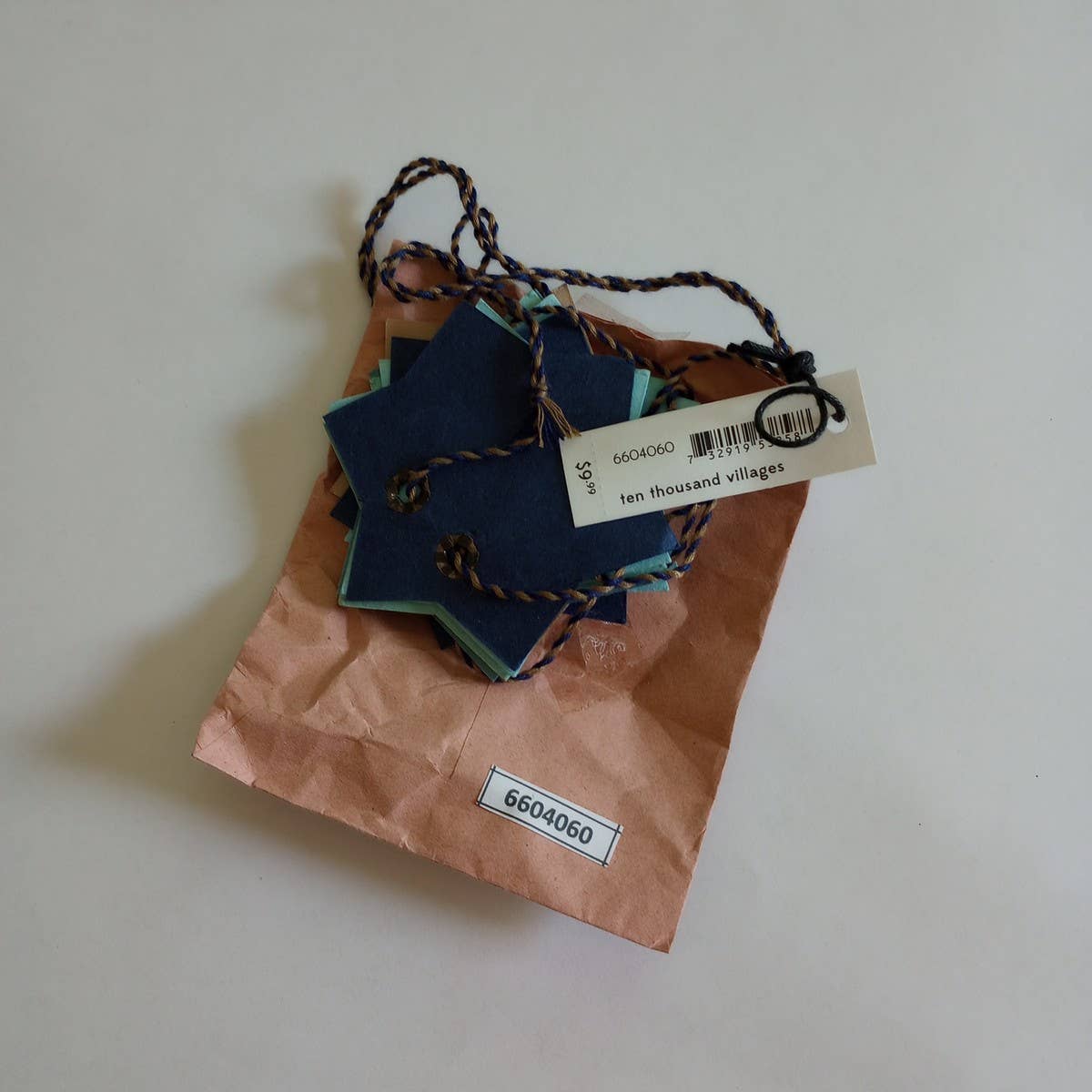 Style this sweet 6 Point Star Garland along a mantle, a window, or a doorway. This garland, especially when combined with additional pieces is a lovely sustainable way to decorate. Handcrafted by artisans with Prokritee, an organization that provides jobs and skills training for women in under‒resourced communities in Bangladesh. * Materials: Paper - Measures: 10 stars, 2.5"D along a 39" string not including the looped ends - Notes: stars are gold screen printed on one side & punched with metal grommets that allow them to move freely along string - Colors: Blue, teal, tan - Handcrafted in Bangladesh