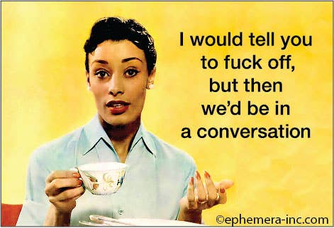 Our Ephemera rectangular magnet, named "I would like to tell you to fuck off, but then…", is a must-have for those who appreciate a blend of sarcasm and brutal honesty. This magnet serves as a hilarious conversation starter, perfect for decking out your fridge or locker. As a supplier of wholesale gifts and novelties, Ephemera brings over 30 years of experience in producing witty items. This magnet is part of our diverse collection designed to cater to your unique sense of humor. Get ready to giggle, chortle, snicker, and guffaw with our delightfully offensive magnet.