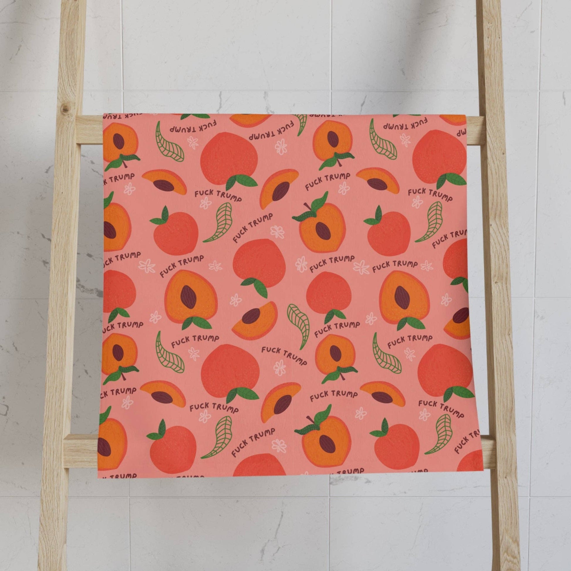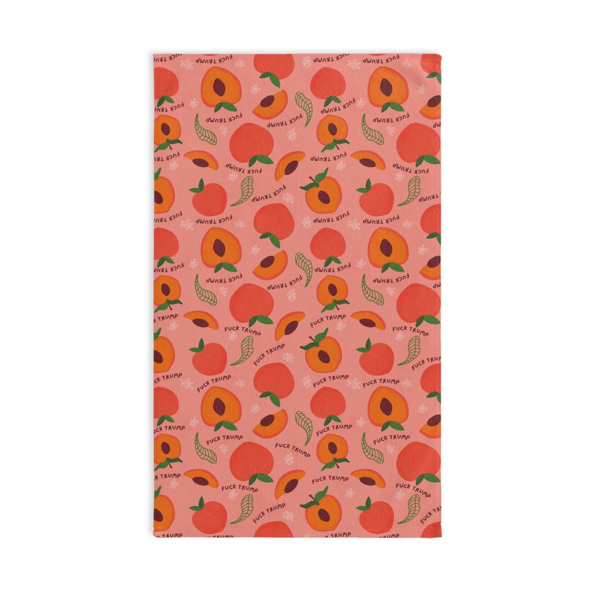 Add a subtle dose of rebellion to your space with this imPEACH “F*ck Trump” peaches hand towel—perfect for your bathroom, kitchen, or as a gift for your favorite liberal. It’s soft, functional, and printed with a little protest.
