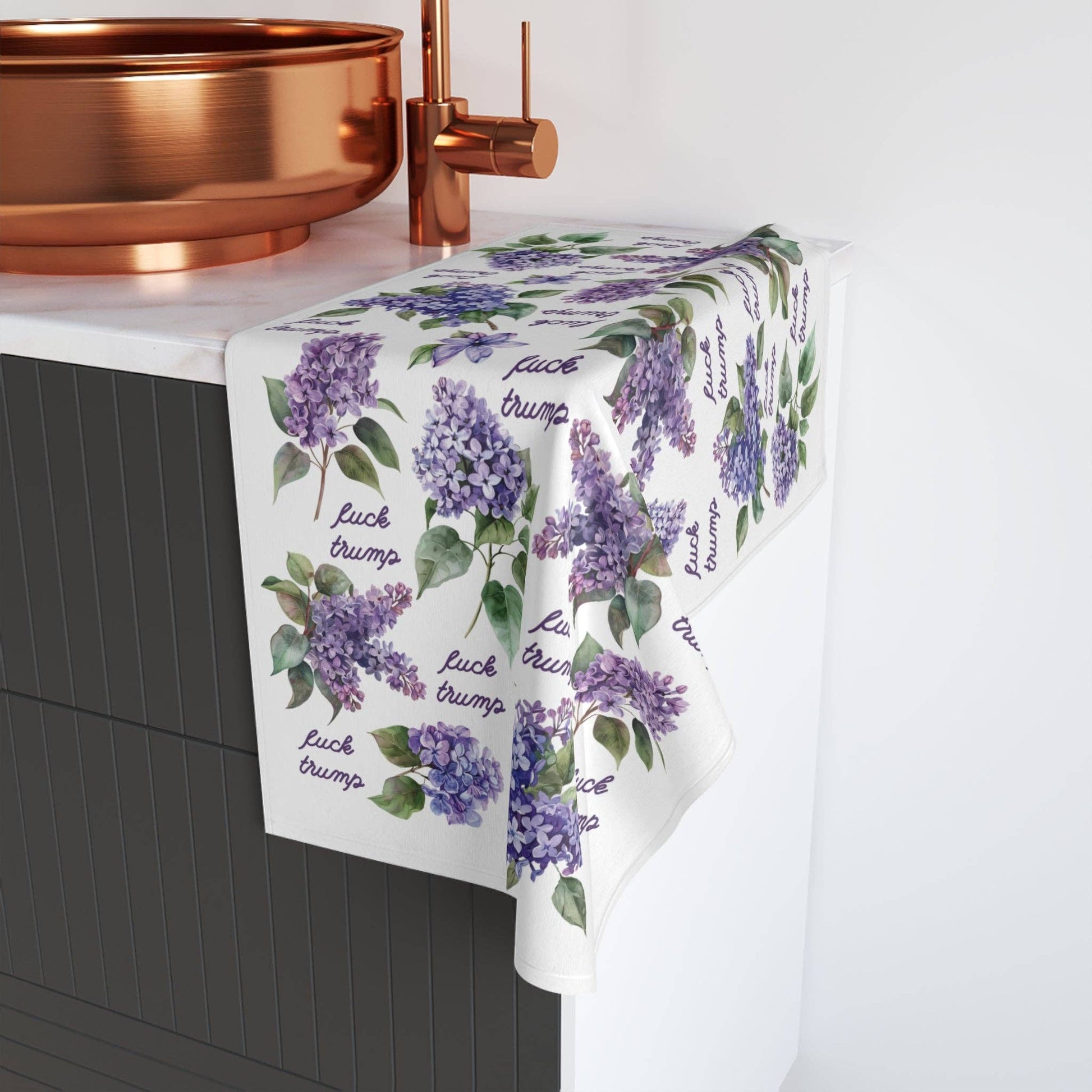 Add a subtle dose of rebellion to your space with this lilac “F*ck Trump” hand towel—perfect for your bathroom, kitchen, or as a gift for your favorite liberal. It’s soft, functional, and printed with a little protest.