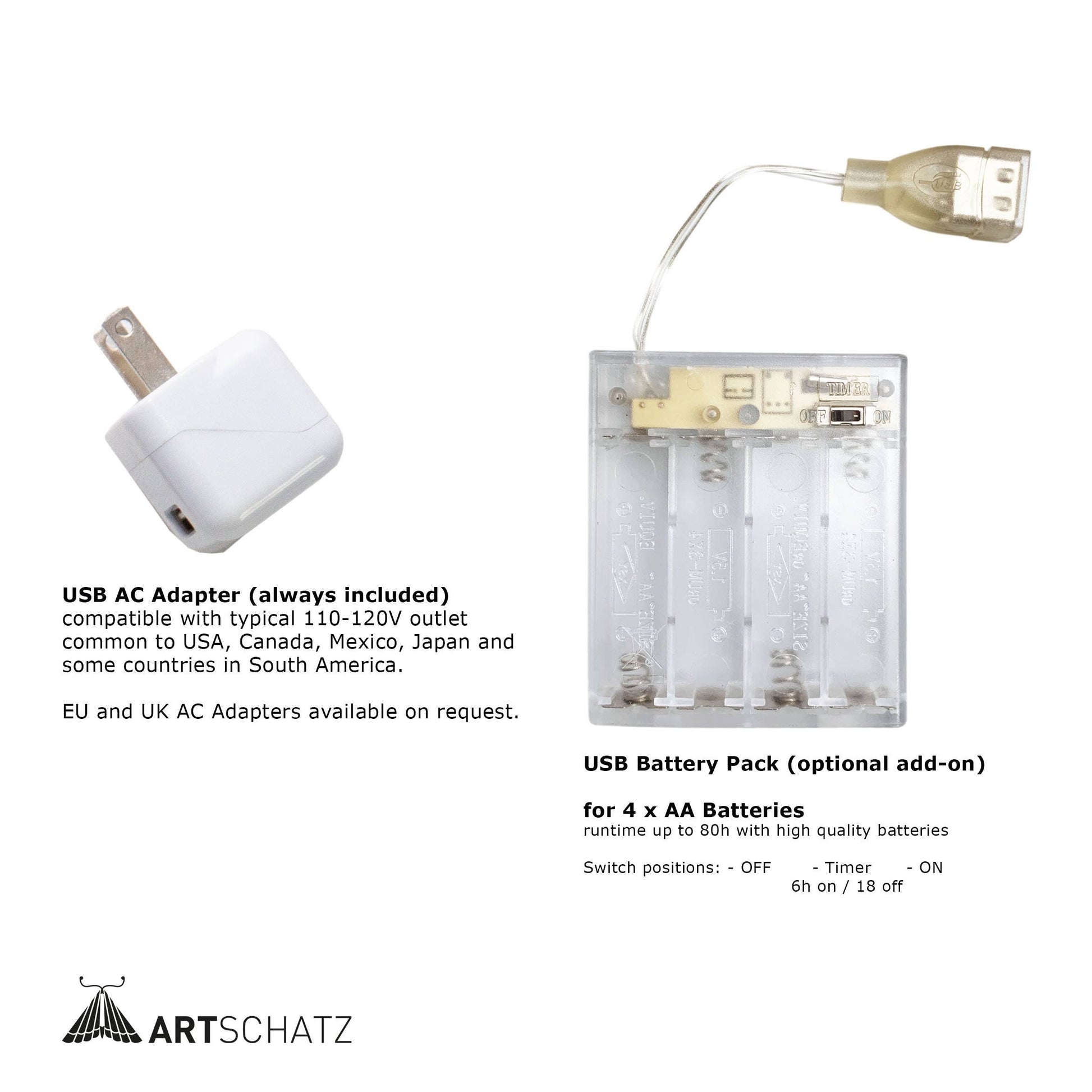 for 4 x AA Batteries, runtime up to 80h with high quality batteries, Timer function 6h on / 18 off.