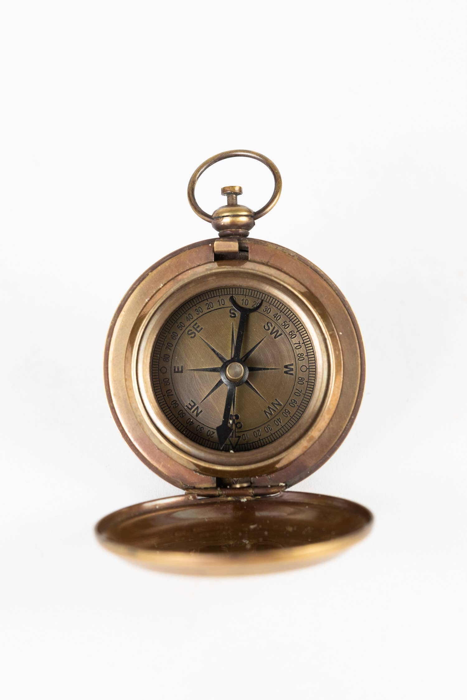 The Voyager's Pocket Compass is made of brass with a glass cover over the compass face. It employs a hinged cover that when opened by pressing the release button, reveals a compass inside. The cover features an etched anchor and nautical design sure to delight any sailor (or hopeful sailor).